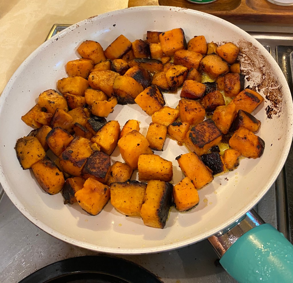 4. Warm large skillet over med-high heat and add potatoes stirring and flipping often. You may find it necessary to add a bit more olive oil or maybe even plant butter or grass fed organic butter