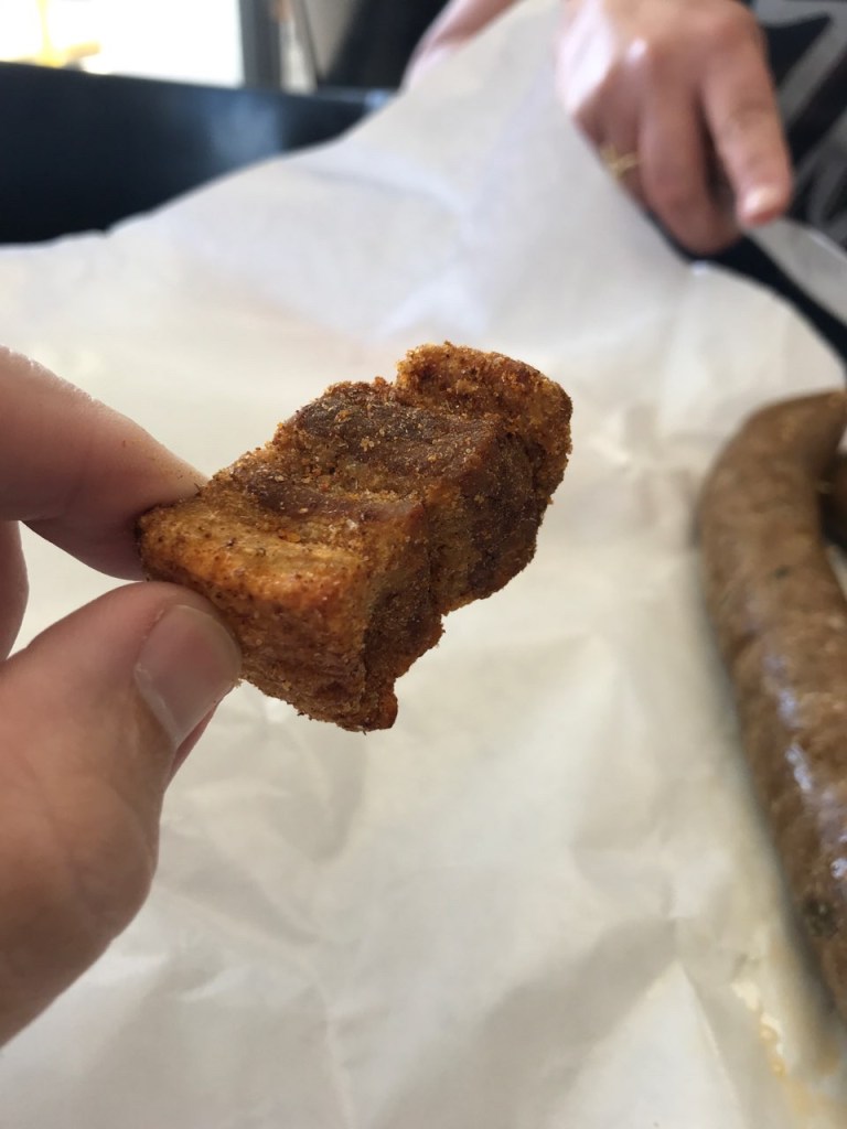 A recent family wedding brought my husband and me back to our home state of Louisiana. We had a day to roam around and explore our old stomping grounds. While much had changed,we knew that the food probably had not. Everyone knows you can only get authentic Cajun and Creole food in Louisiana. The one thing I was craving over everything else was a good link of *Boudin (pronounced “Boo-Dan”) while my husband wanted cracklings! With technology at the tip of our fingers, we did a quick search and it pointed us to this little Cajun gem: Quebedeaux’s (pronounced “Coo-buh-doughs”) and it did not disappoint. The owners are a husband and wife team who bring their Spanish and Cajun heritages together to create food that is absolutely delicious!