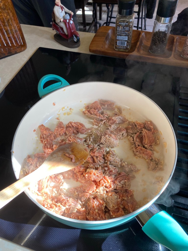 3. Brown sausage and also add chopped garlic at this time
