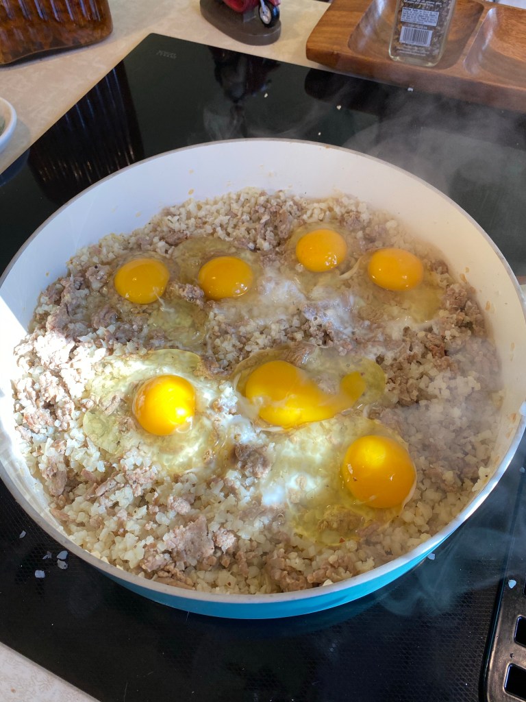 6. Break 6-7 eggs right over top of mixture then begin to fold in. Cook for about 3 more minutes, stirring constantly. Then turn of heat and let sit for about 2 minutes.