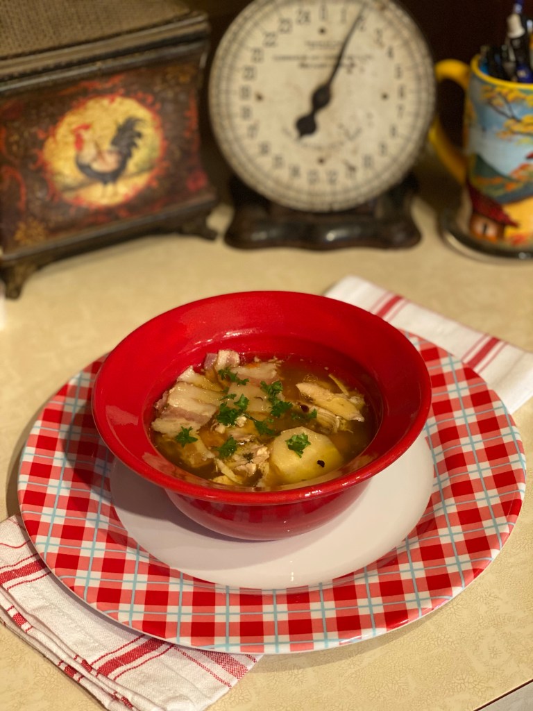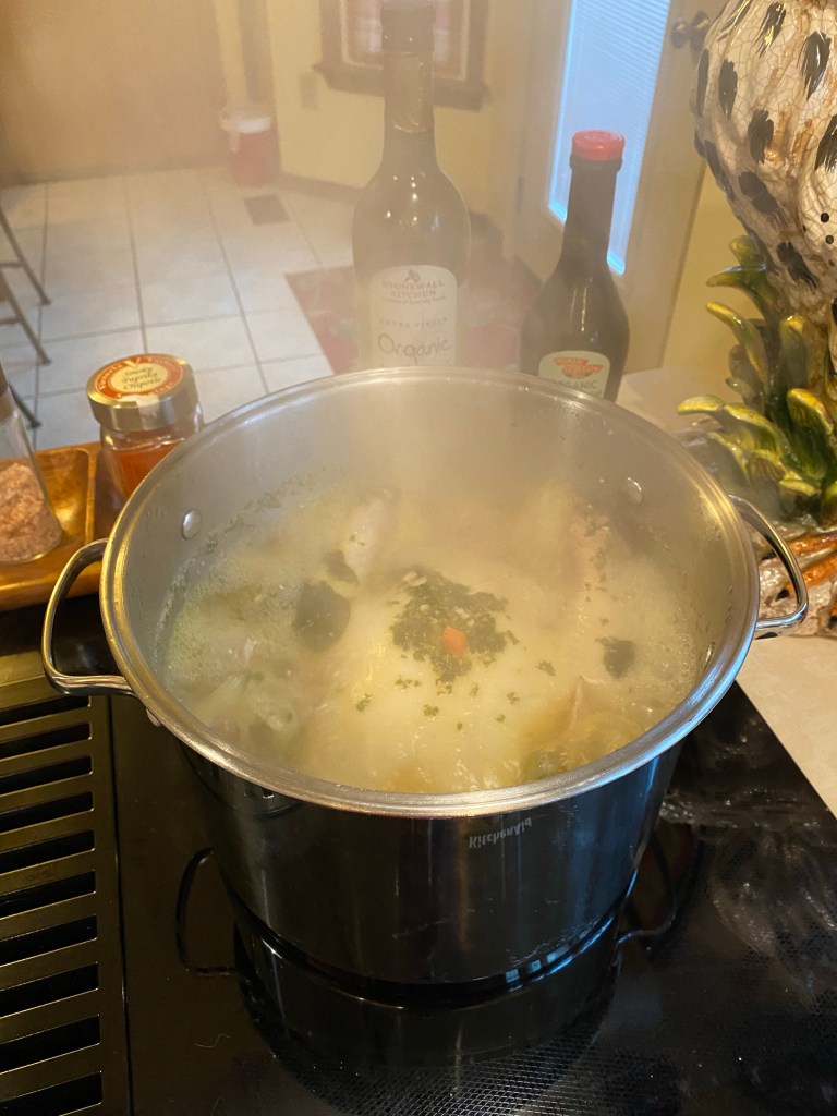 1. Boil whole chicken on med high in bone broth with bay leaf. Be sure to reach inside the chicken beforehand and pull out giblet bag. Open bag and pour giblets into boiling chicken as well.