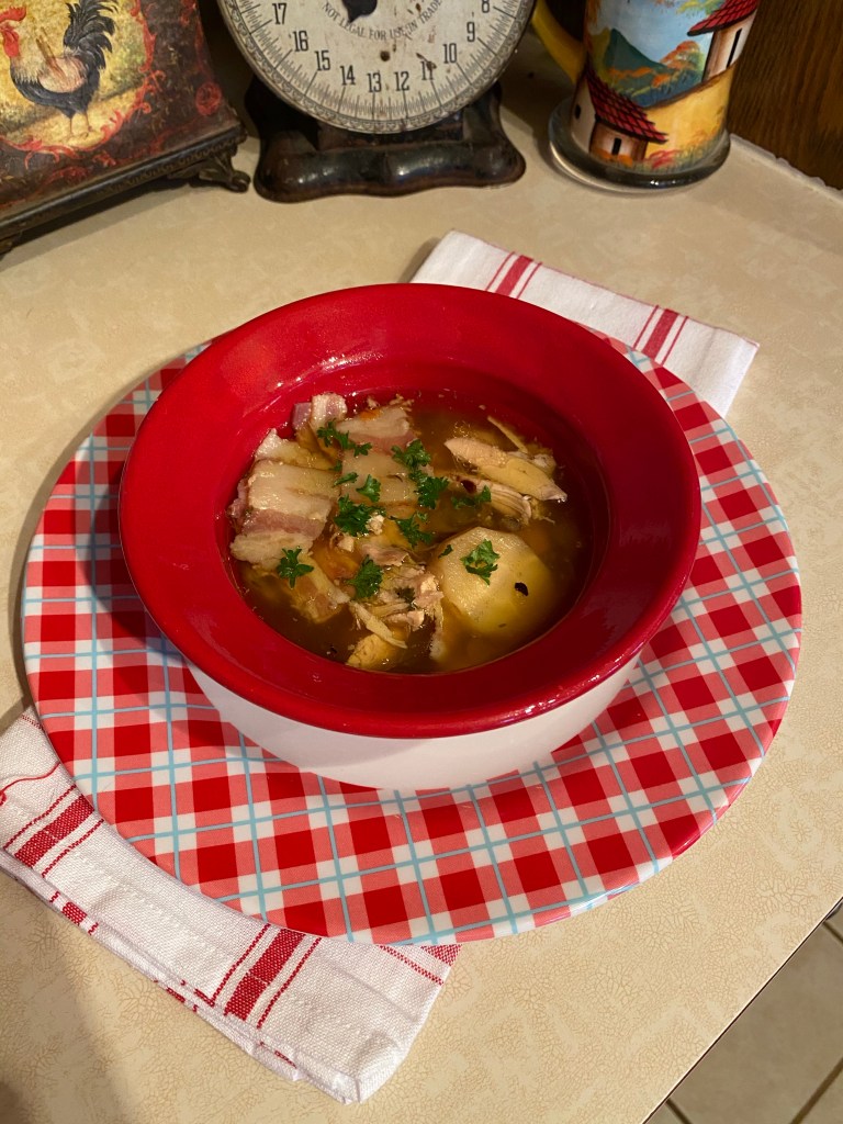 7. While vegetables are cooking in broth, debone chicken into bite size chunks and add to soup mixture.